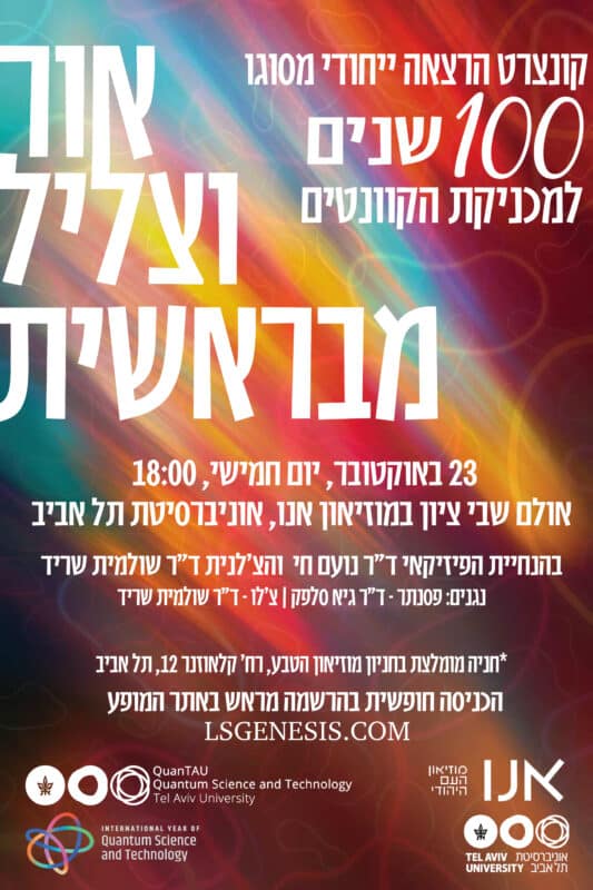 This year, the world celebrates the centennial of the development of quantum mechanics—a scientific framework that has driven revolutions in technology, culture, and everyday life (even when we are not always aware of it). In honor of the occasion, and under the auspices of Tel Aviv University’s Quantum Center, I invite you to a one-time evening that unites science, music, and art. We will embark on a historical journey from the Big Bang to the present day, discover surprising phenomena in quantum mechanics, and compare physical and musical ideas, from the classical to the modern world. This evening, we invite you to learn about the wonder of the universe and be moved by the artistic beauty it offers.