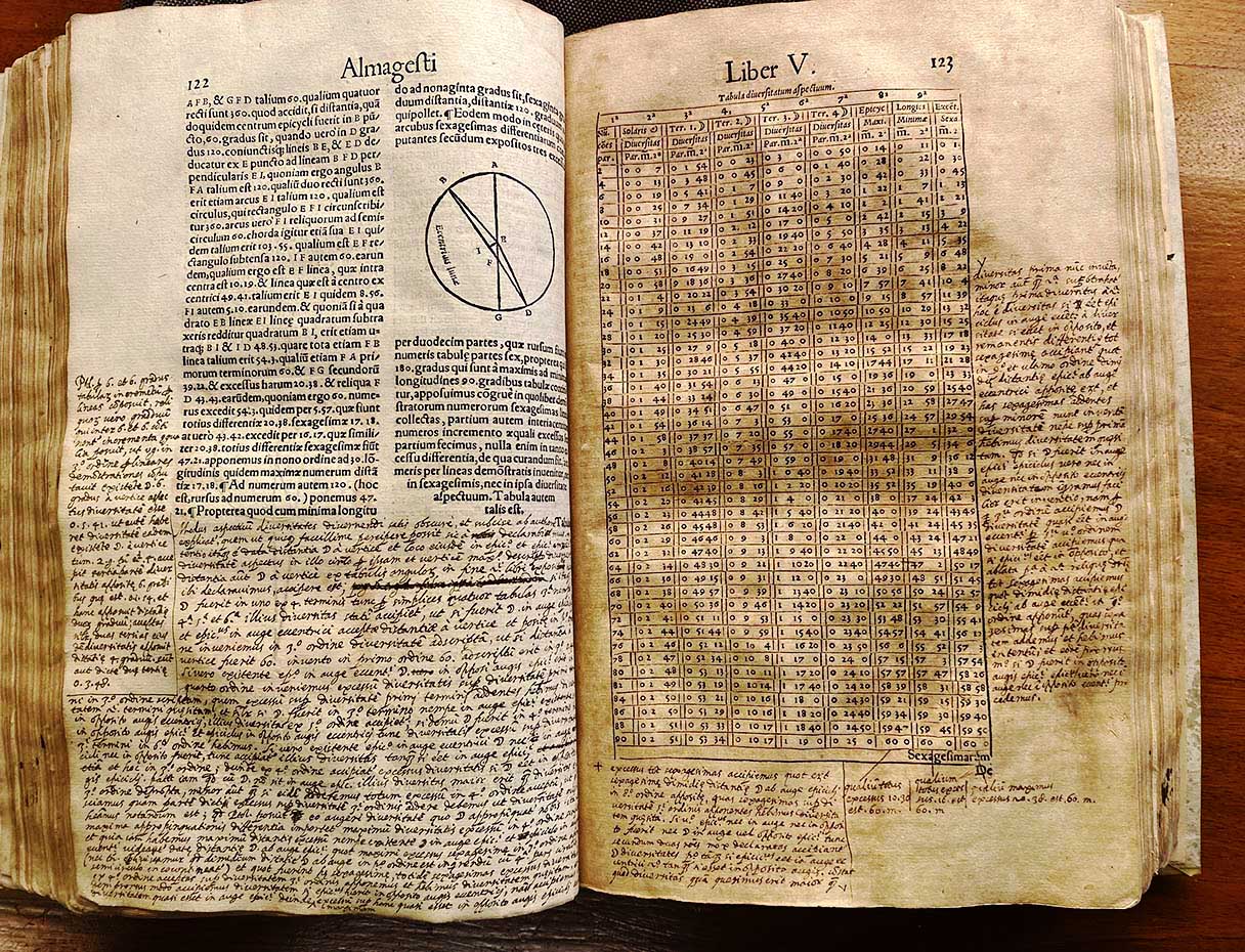 A historian has discovered that a 16th-century printed edition of the Almagest — an ancient and influential astronomical treatise — includes numerous handwritten footnotes by Galileo Galilei, the astronomer who later challenged the geocentric view of the universe presented in that treatise. Courtesy of the National Central Library of Florence.